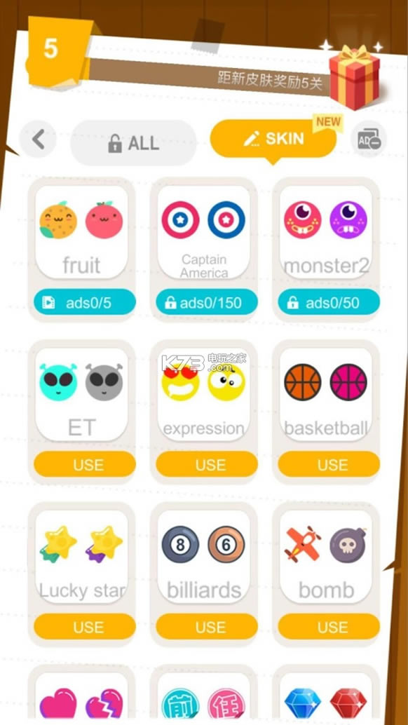 1、不是一个关卡解锁一个新皮肤,皮肤虽然很多,但是需要连过几关。