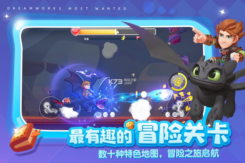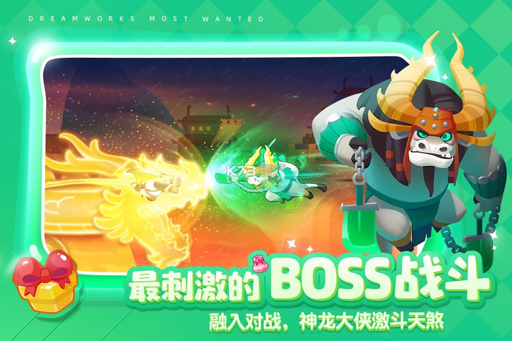 除了接力赛能让角色们全部登场以外,《梦工厂大冒险》更要照顾到了每一位电影IP粉丝的心,为粉丝们上演一场精彩的回忆杀!于是他们便在游戏中加入了剧情玩法,不光能让各位粉丝重温阿宝为梦想奋不顾身最后成为神龙大侠的故事,还能听见小嗝嗝隔空对没牙仔的呼唤,同时巧妙的将经典电影情节与关卡相结合,足以让你一边体验关卡的刺激一边沉浸美妙的故事情节。