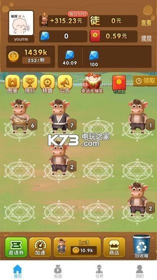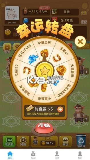 一款通过模拟养牛就可以轻松赚钱的手机游戏,玩家在这款应用中需要经营好自己的养牛场。这里有合成的玩法,越高等级的牛可以给自己带来的收益越多,这里每天还有红包掉落,还有幸运大转盘可以抽取好礼。这款游戏中的收益是可以转换成真实收益的。