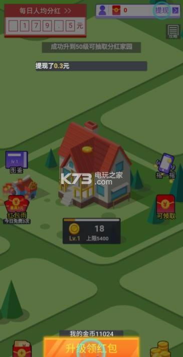 一款造房子领红包的模拟建造游戏,在空地上放置建成完美家园,房子的等级越高,每秒自动赚钱的速度更快,收获大量金币解锁新的房子,放在空地上继续合并进化,游戏玩法类似疯狂金币场,所有玩家都能享受房地产大亨的赚钱乐趣。