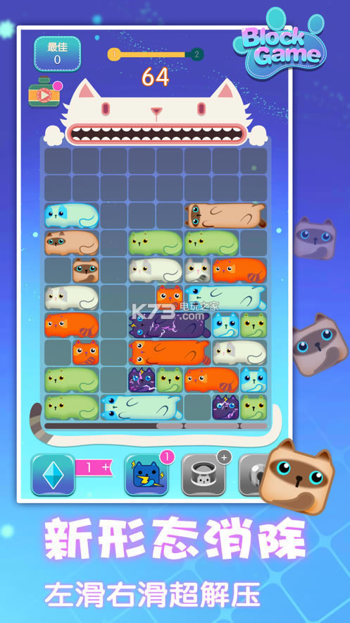 免费下载有史以来最可爱的游戏,这是一款超萌的消除手游,游戏玩法非常简单,左滑右滑消消消,水平移动方块来填满和清除整行。还有各种效果惊人的道具帮助你度过难关哦。
