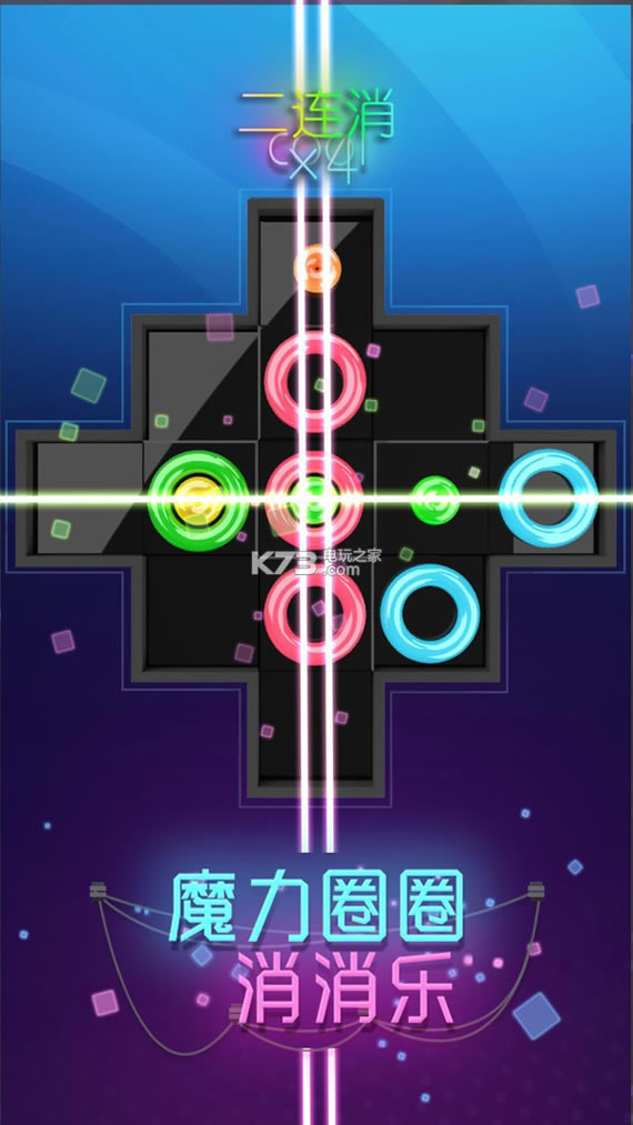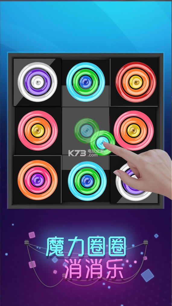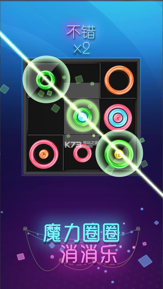 炫酷霓虹灯风格的三消游戏!滑动屏幕,放置满屏的魔力圈圈!任意方向出现三个连续且颜色相同的圈圈就可以释放魔力,消除圈圈!三种不同的模式,超多关卡道具,让你嗨到不行!炫酷消除特效,魔性英式英语配音,释放压力不二之选!