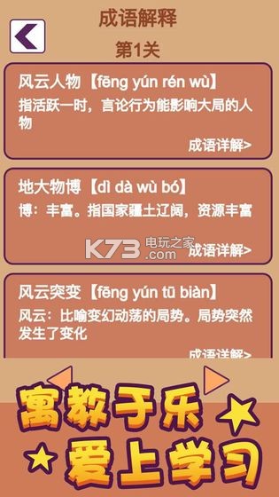 《成语大秀才红包版》一款非常寓教于学的成语趣味游戏, 通过给出的字去猜测更多的成语, 完成关卡挑战还有红包奖励,不断的丰富你的成语词汇量,让你学习更多的成语知识。