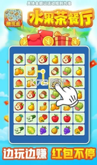 《水果茶餐厅》红包领取更多的红包,有着很多档位的红包,并且都可以真实领取的。需要玩家点击两个相同的方块连接消除,不是三消,而是连接起来,不能连接的则无法消除了。能够使用下方的道具帮助消除。