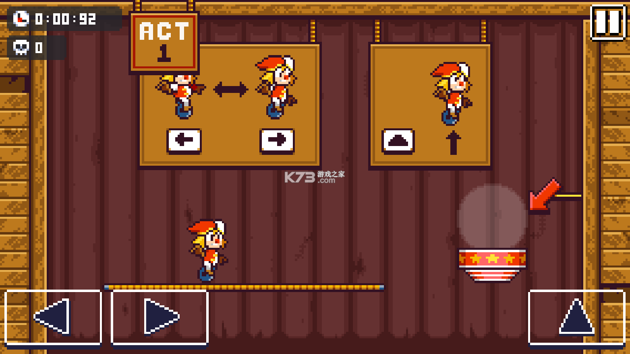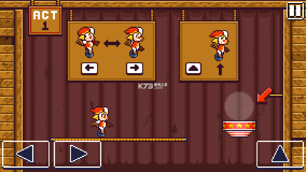 走钢丝剧院游戏是一款像素画风的冒险闯关游戏,在这里,玩家只需用手指操作小丑来挑战他们。在通过关卡的过程中,有许多障碍物阻挡着他们,这需要灵活的操作来避免,完成任务后,可以解锁新级别。