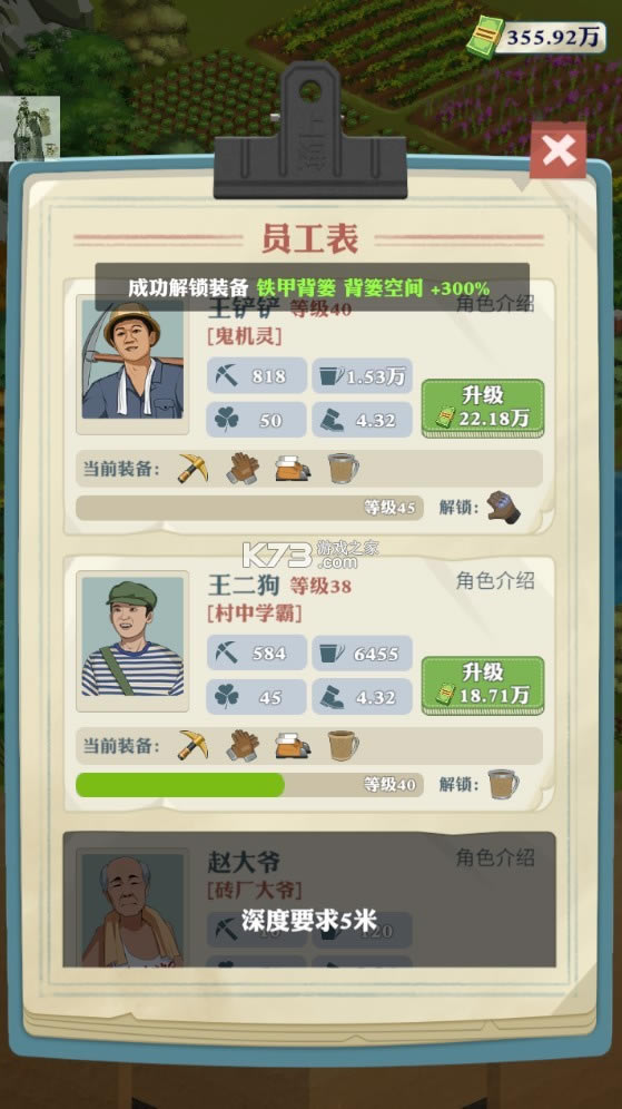 《王铲铲的致富之路》是一款经典怀旧风格所打造的模拟养成游戏,全新的经营玩法,90年代怀旧画面,以挖宝玩法为主,通过挖掘地下更多的宝贝赚取收益,可以雇佣你们村里的人一起挖掘宝贝,有钱大家一起赚,超多挑战任务等你来完成。在游戏中你将从挖土开始建立属于自己的财富中心,升级设备,挖出的古董还可以进行展览,玩法趣味丰富,让你体验到当老板的滋味。同时可以召集村民挖地,获取各种物品,售卖赚取金钱并发展村庄的运输行业和工厂,升级角色的挖掘速度,可挖掘更深层更有价值的物品,建造仓库等各种建筑,轻松的放置挂机体验带动村庄致富之路吧。