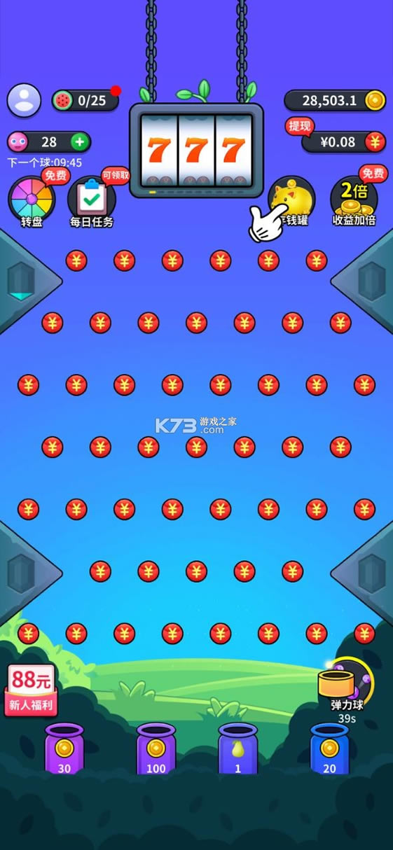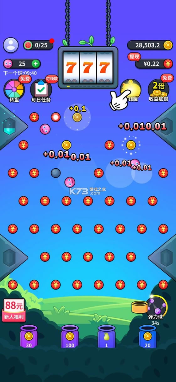 一款物理玩法的弹球游戏,轻触屏幕开启一段开心的旅程吧,让弹球为你们无限得分,让你感受欢乐的时光,只有分数达到才能过关。
