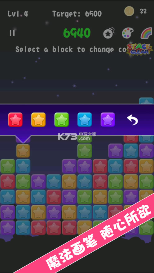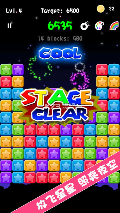 2、消除方法。颜色相同并连在一起的星星,可点击消除,消除的方块越多分值越高;