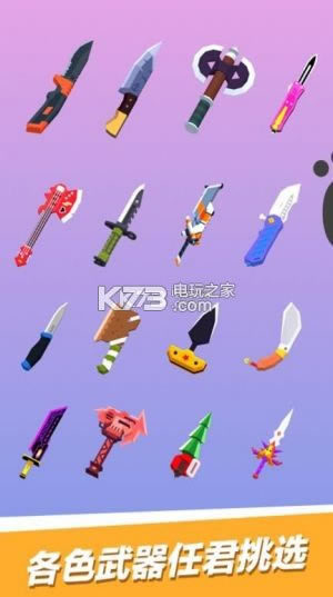 2、武器众多,玩家在游戏中不止是可以丢斧头,还可以丢菜刀,丢匕首等,欢乐有趣;