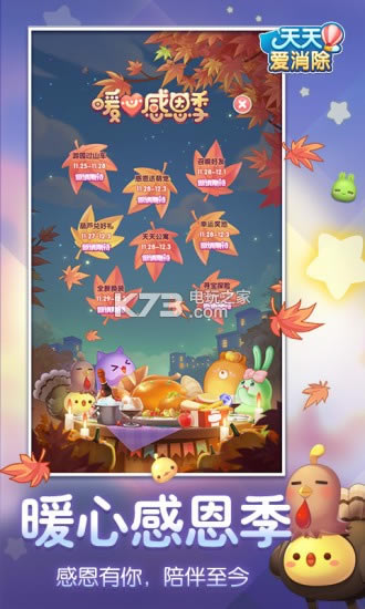 《天天爱消除》在深秋之后推出新版感恩版本,照理加入新关卡和元素,天天爱消除2019感恩版本中四娃也将进入到玩家的视野中,和他一起展开更加趣味的消除战斗吧。