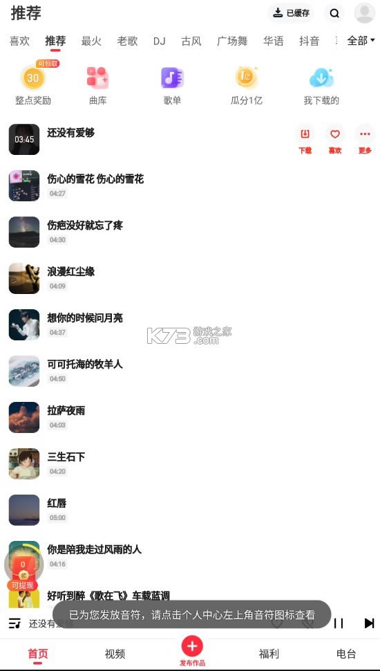 过软件首页当中热门的歌曲推荐,然后来选择你喜欢的音乐。