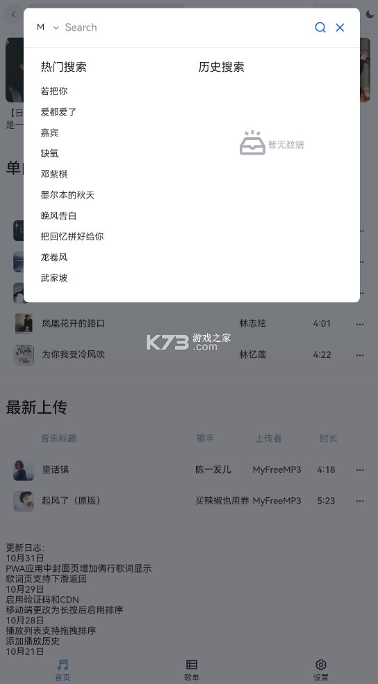 内置12个音乐搜索接口,搜索框下方还推荐了一些热门搜索歌曲。