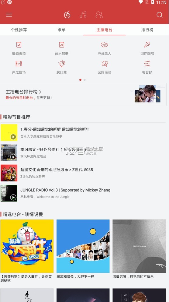 2、用户自上传【主播电台】,音乐故事、脱口秀、情感话题,每个人都能轻松表达自己。