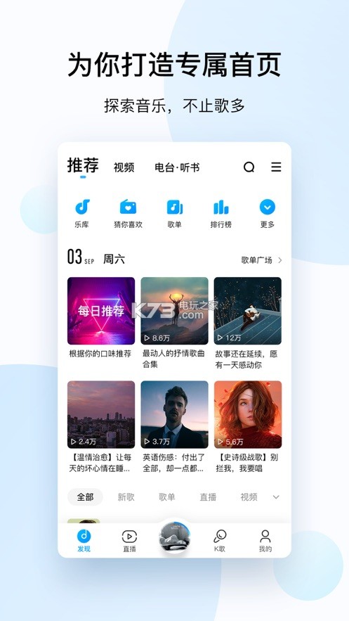 耳目一新的乐库,新歌速递、权威榜单,精选歌单,你要找的音乐,都在酷狗曲库