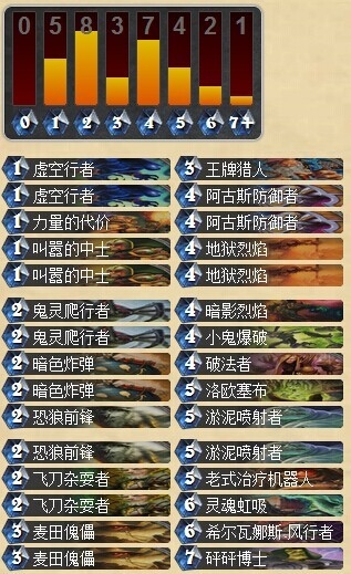 动物园:蓝胖子,暗色炸弹,鬼灵,麦田傀儡,当他比你有场面优势的时候,你有各种办法来解决掉他的占场,例如,暗影烈焰,小鬼爆破还有地狱烈焰。越到后期,他赢得可能性越小。目前最简单的对手。
