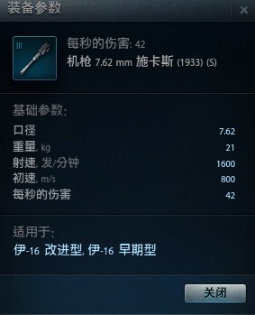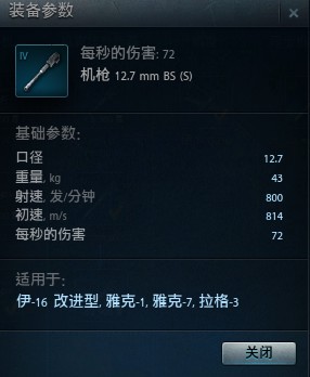 先说主武器12.7mm机枪,射速每分钟800发,初速814,也是属于传家宝类型。伊16主武器的射速和机枪弹的初速相当不错的,主要在于12.7mm机枪的射速和初速很快,击杀被锁定目标能力强。相反就会减弱,容易使目标逃脱。