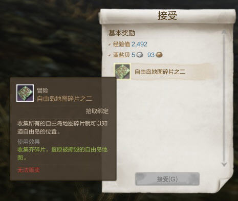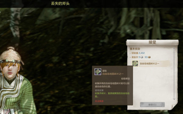在古代森林接取任务,可以获得自由岛地图的碎片,凑齐碎片后可以复原自由岛地图并获得任务。