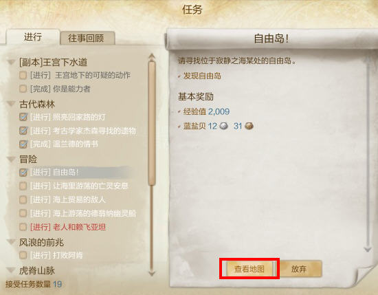 在任务面板上可以看到获得的任务,点击查看地图可以看到自由岛的位置。