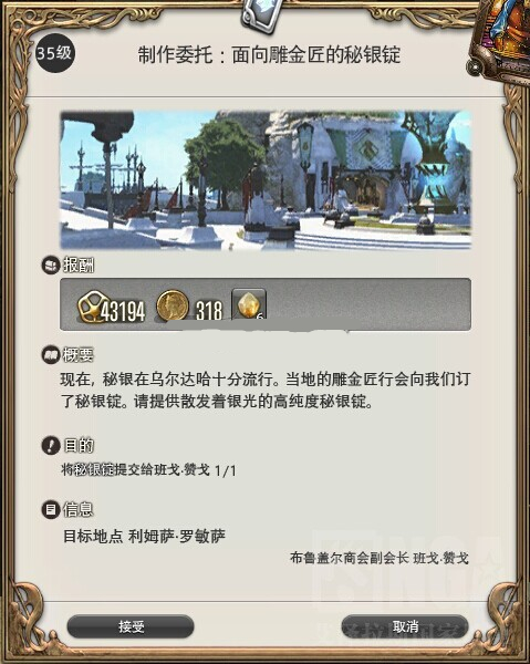 35级,同NPC,可以接到交1个秘银锭的理符,1个HQ秘银锭8W6+经验,可一直交到满级(PO主目前43,也许45有新的交锭任务,根据材料成本和HQ难度来决定是否更换)。