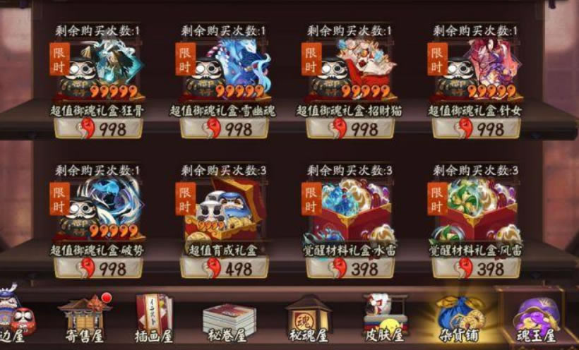 大号体力全部用来升级等级,先把自己式神星级练度。提升起来,然后勾玉先不要去抽卡,先去商店买商店御魂,破势,狂骨皆可,如图: