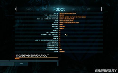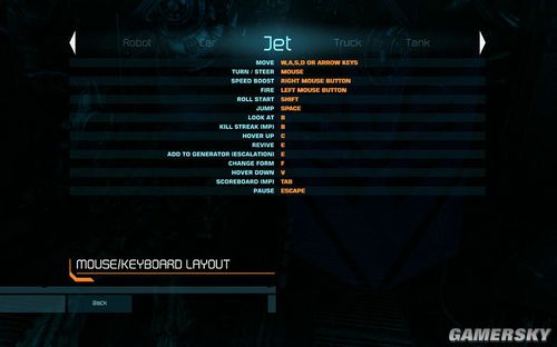 移动还是WSAD模式。攻击同普通的ROBOT模式一样。切换变身模式则是按F,跳跃则是按SPACE。按鼠标右键则是可以进行加速前进