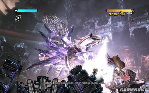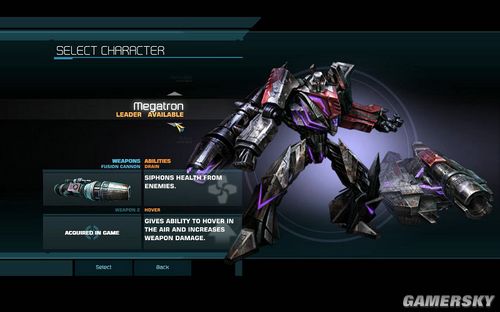 这就是我们霸气的威震天了。主武器是FUSION CANNON,威力强大的能量炮;前期对付小兵几乎是一炮搞定。普通模式下的特殊技能是吸取敌人的生命