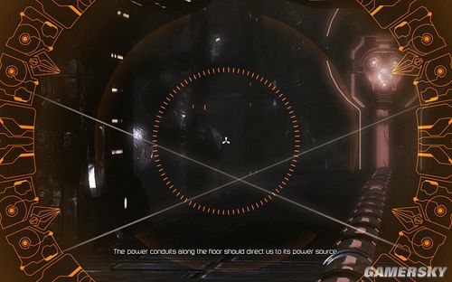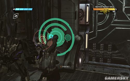 然后来到下图的机关处。以后凡是出现这样有细线的区域都是有警报器。如果你没有解除警报源直接闯过去。那么里面会出现大量的炮塔来攻击你。所以大多时候,建议还是不要硬闯
