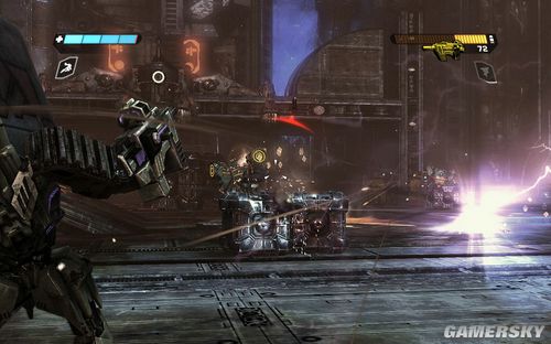 此时会出现大量的盾牌兵,这是非常难对付的家伙,建议变身为汽车模式快速移动到他的身后扫射之。沿路可以捡到一些机枪炮塔,拿这个对付也是不错的选择