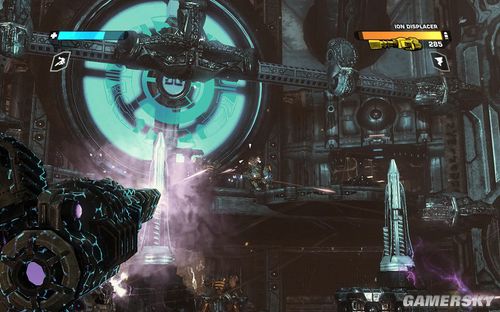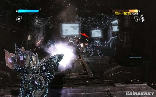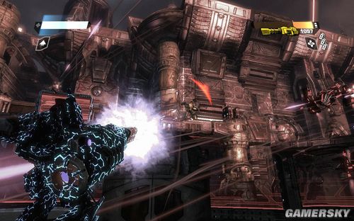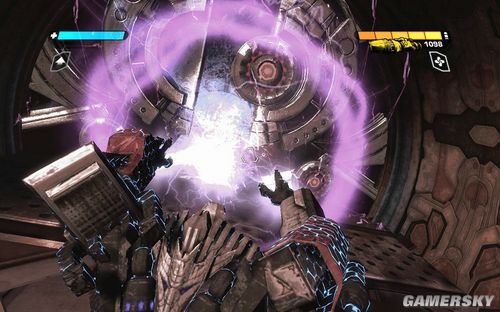 然后沿路冲上炮塔,注意此时会出现一个血量非常多的盾牌兵。这个盾牌兵不仅仅可以防御你的大部分攻击,而且一锤子下来,就相当于投放一颗EMP炸弹。如果你在附近就会受到一定程度的电