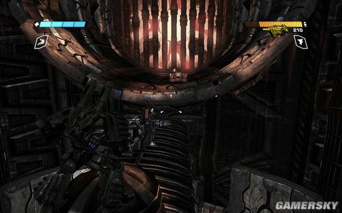 然后一路跳下,来到核心部位。这里有非常多的敌兵在守卫。而且都是导弹侦查兵。一旦你被他们的瞄准器瞄准就会有导弹自动来攻击你。不过附近的柱子可以作为掩体来遮挡