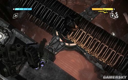沿路的平台可以捡到又一个新武器,导弹发射器。长按R键即可捡起。不过不建议使用,导弹发射器的动作实在太慢,使用冲锋枪还是比较容易对付这些速度极快的飞行兵