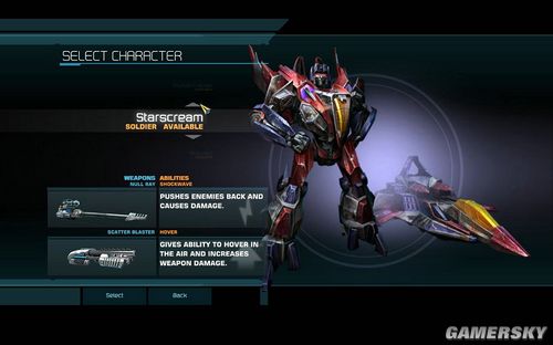 STARSCREAM,SOLDIER。主武器是NULL RAY,类似于连发狙击枪,第二武器是SCATTER BLASTER,威力较大的散弹枪,对付移动极快的敌人和压制敌人火力有奇效