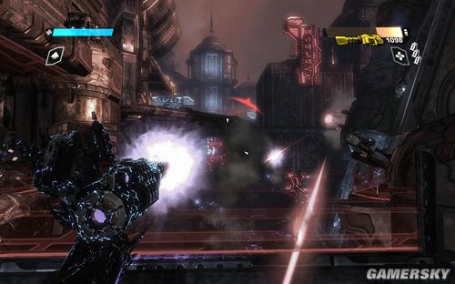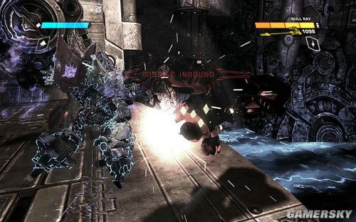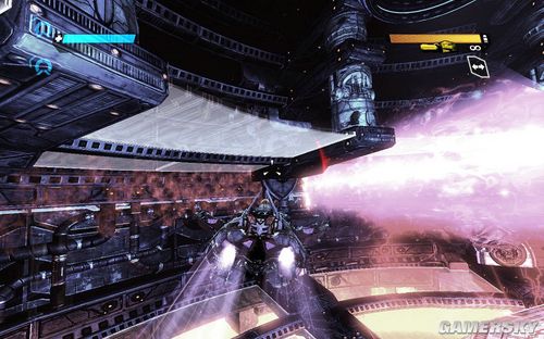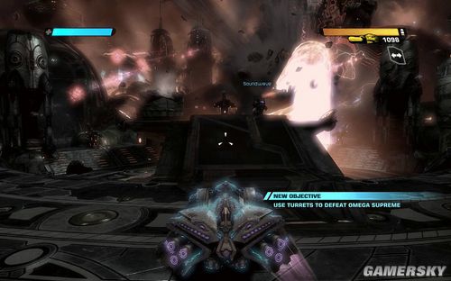 不过此时的OMEGA才是最可怕的。首先左边则是放出巨型的能量炮,右边则是释放出大量的导弹。而且身后还不时放出成群的导弹。一定要快速移动,注意找附近的掩体躲避