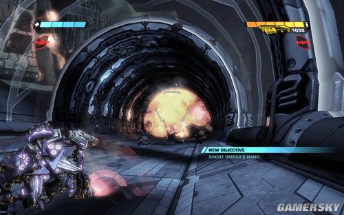 一路前进到通道,此时可以看到OMEGA突然出现,瞄准疯狂射击打跑他