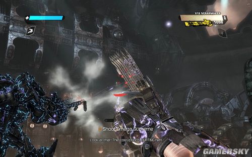 在OMEGA不攻击的时刻,建议去对面的平台更换你的武器。你可以拿到新的电磁能量炮和三管机枪