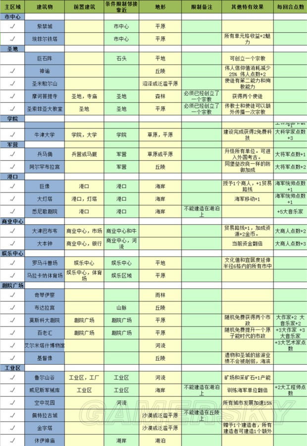 图标中没有提到的建筑都是普通可建建筑,所以限制条件和加成不再一一说明啦。
