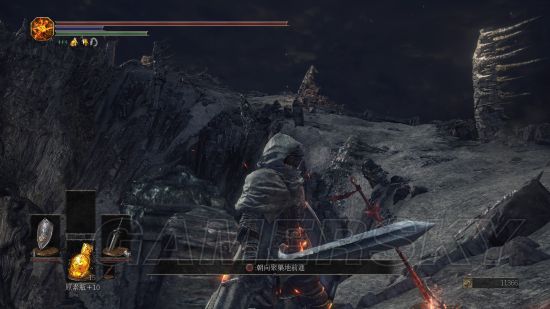 右边沿尖塔的边缘过来捡取余火X1,然后回来灰烬地上你会在悬崖边发现一条官方的建言并配有盖尔爷爷的动作,但不从这里下去,因为这会不可避免的要打一群怪。