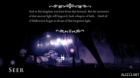 之后如同游戏一开始的4行挽歌(elegy)写的一般,the pale king教会了人们很多东西,所以渐渐的人们开始忘记了the radiance即the old loght,王国(hallownest)就是在这种情形下建立了起来,SEER称之为背叛。