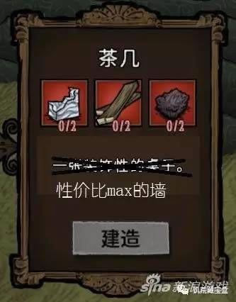 导读《饥荒》中我们造墙来抵御危险,但很多时候,常常是墙毁人亡,因为我们的墙根本抵御不了怪物的攻击!而今天就教你们如何让怪物不攻击你的“墙”也就是今天要说的——茶几。>>>>《饥荒》十大实用与无用食谱详解可是我翻遍了建造...