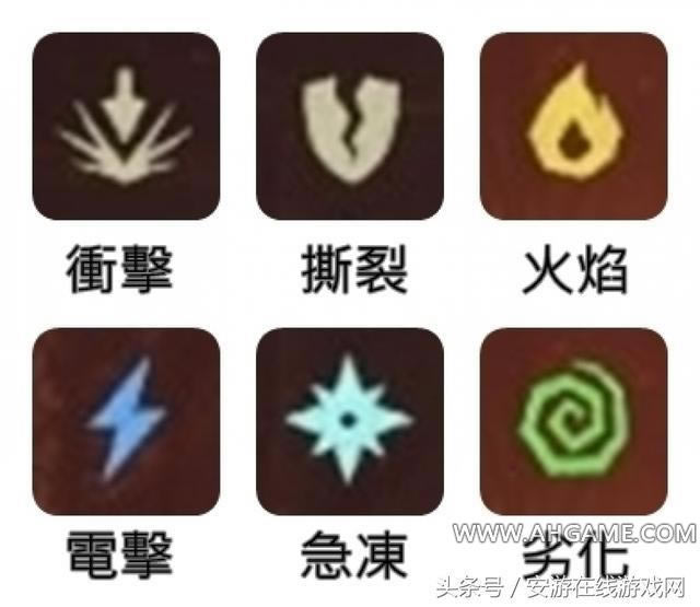 游戏中主要有了6种攻击「属性」,可以针对敌人弱点之余,部分属性当打在敌人身上时亦会出现属性计条,把它累积完成就能追加效果,发挥属性攻击的真正价值,以下逐一说明: