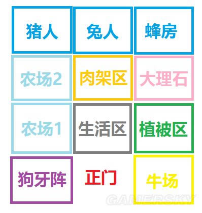 终于到了九灭火器的豪宅了!那么我们开始吧。跟八灭火器相比,九灭火器家有几种选择:一是多一个模块的农场,就相当于两块农场;或者浆果和草树枝分开,一块浆果区一块草树枝区;或者直接多一个休闲娱乐区,做一些雕像啊玩具之类的。我的话比较喜欢农场,就造两片农场吧。先上规划图: