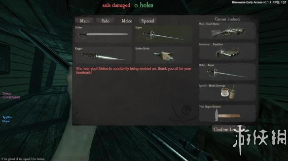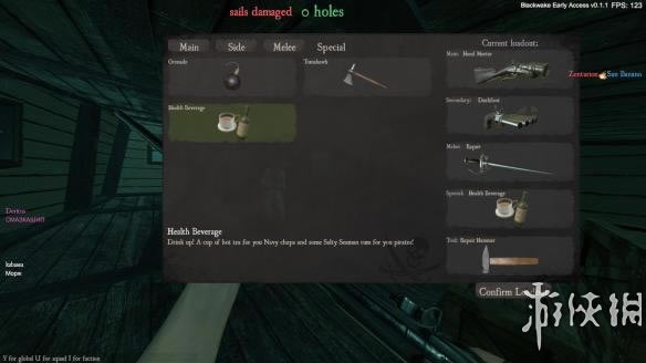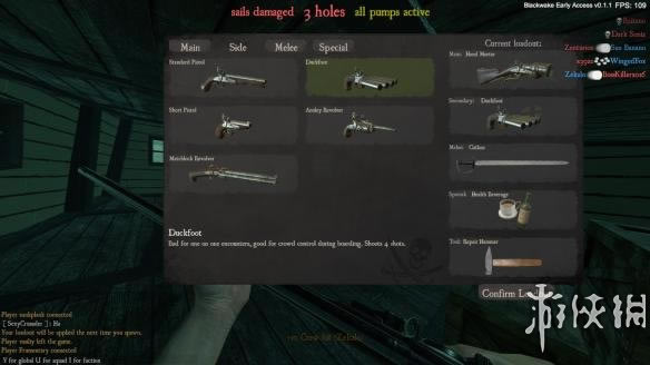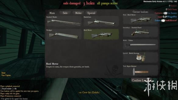 选择完阵营之后,你可以选择自己在哪条船上服役,选择完之后就会让你选择你要用的主武器、副武器、近战武器以及一件特殊装备。当然在船上出生之后你的身上还会有锤子用来修理用的。目前总共有4种主武器standard musket,blunderbuss,nockgun以及hand mortar,不过这里面只有standard musket能够进行远程瞄准,其他三种武器基本上是用来近战厮杀用的。这里推荐hand mortar,杀伤力巨大,作用范围也大,面对多个敌人时完全不虚。选择完主武器之后我们就可以选择副武器了,当主武器没有弹药的时候副武器就非常重要了。