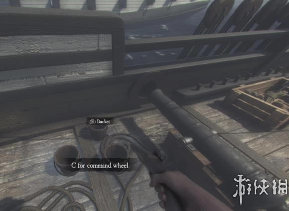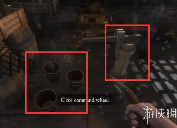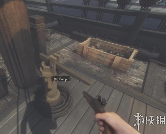 此处在船身中间左右,左边是桶,右边是泵。排水,救火用。