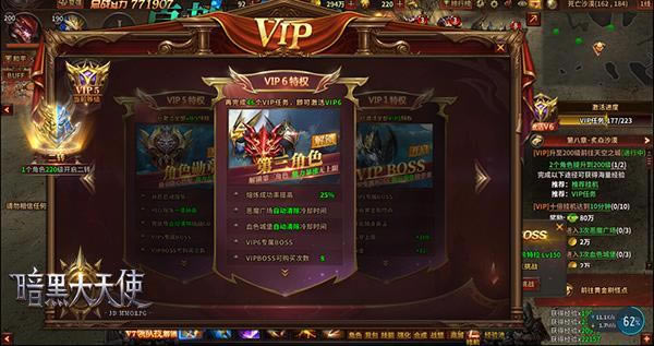 《暗黑大天使》传承经典端游体验,打造诸多创新玩法。多元化职业体系架构,百种不同天赋成长方向,让每个职业可以演变不同路线,打造高自由度“一人一角色”的游戏世界。海量特色玩法,恶魔广场、血色城堡、地宫试炼、“免费升级VIP”,玩家无需充值就可升级VIP,享受多项特权加成。只要在游戏中完成对应任务,即可解锁更高的VIP等级,创建第二、三角色、装备自动熔炼、经验加成、免费传送、更多副本次数、每周福利礼包、远程商店等功能。