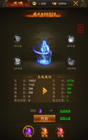 龙魂系统由人魂、地魂与天魂三部分组成,每一部分又由不屈、狂暴、幸运、斩杀构成,消耗人魂石、地魂石和天魂石可分别进行升阶,消耗人魂石和地魂石还有几率合成天魂石。