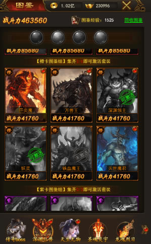 图鉴系统涵盖传奇BOSS、深渊巨兽、天生尤物、圣魂炎宇、龙魂烈日、神魂血月、传奇神兽、万物主宰、雷神灭世九部分图鉴。图鉴激活后,可永久增加主角和英雄属性,提升角色的攻击、物防、魔防、生命值四大属性;品质越高的图鉴,所得到的战力越高。