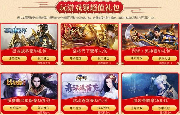 《黑域战界》、《猛将天下》、《烈斩·灭神》、《镇魔曲网页版》、《武动苍穹》、《血盟荣耀》……春节期间,多款游戏携超值豪礼来袭,就等你来领取!玩家通过活动页面登录/注册帐号并试玩游戏3分钟,即可领取对应游戏礼包,还附带抽奖次数。数量有限先到先得,每款礼包每位玩家仅可领取一次。