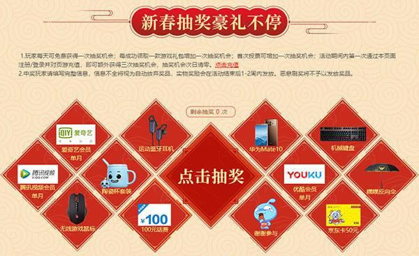 玩家每天可免费获得一次抽奖机会;每成功领取一款游戏礼包可增加一次抽奖机会;首次投票可增加一次抽奖机会;活动期间内第一次通过本页面注册/登录并对页游充值,还可额外获得三次抽奖机会,抽奖机会次日清零。点击抽奖,华为Mate10、机械键盘、京东卡……快到碗里来,新的一年,我们就要用新的!