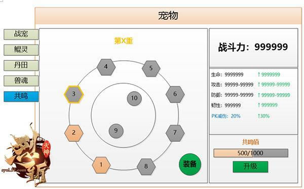 游戏中,在宠物界面新增共鸣系统,开服45天后即可开启。共鸣共有10重,每重10个等级。共鸣等级提升可以增加玩家角色属性,提升共鸣等级需要消耗共鸣值。