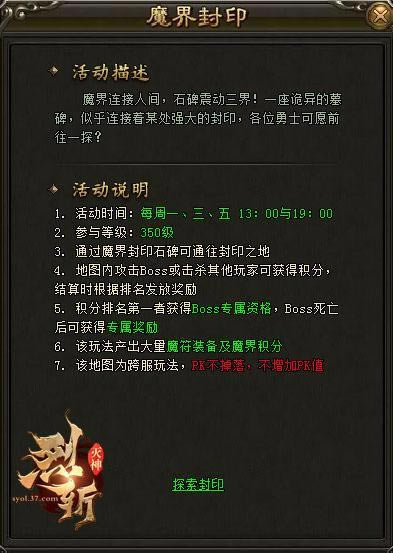 在37《烈斩·灭神》中,魔界封印玩法在开服第十五天后开启,等级大于等于350级的玩家可参与。